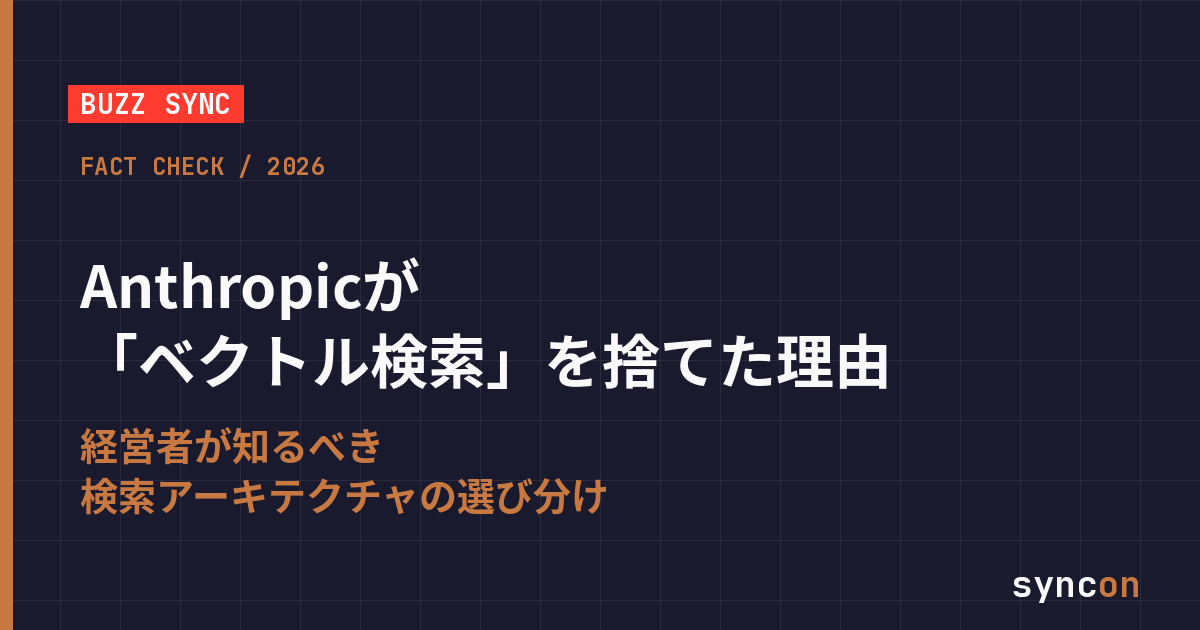 直感に反する話だが、事前インデックスを持たない方式のほうが、精度・運用性の両面でベクトル検索を上回るケースがある。Anthropic公式ブログ[3]とBoris氏のPragmatic Engineerインタビュー[4]から整理すると、理由は3点に集約される。