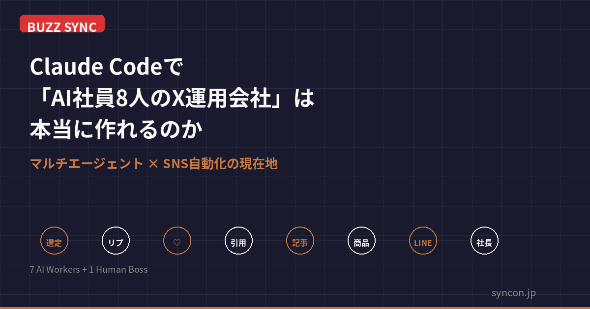 X(旧Twitter)で大きな反響を集めたポストがある。「Claude Codeで超優秀な8人部隊のX運用会社を作りました」──投稿者のKくん氏(@kkk_cun)が公開したのは、Claude Codeのマルチエージェント機能を使い、交流アカウント選定・リプライ・いいね・引用ポスト・記事作成・商品企画・LINE構築の7つの役割をAIに分担させるという壮大な構想だ。