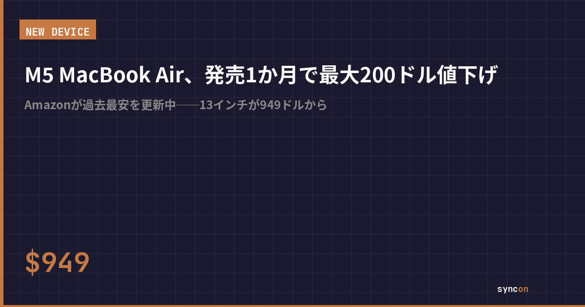 AppleのM5 MacBook Airが、発売からわずか1か月で過去最安値を記録している。Amazonでは13インチ・16GB/512GBモデルが949.99ドル(定価1,099ドル)、15インチ・16GB/1TBモデルは最大200ドルオフの1,299ドルで販売中だ。