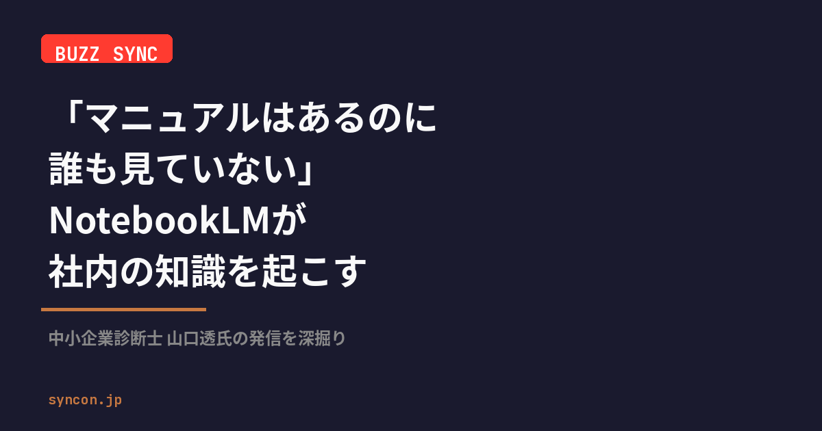 中小企業診断士・ITコーディネーターの山口透氏が、Google NotebookLMを活用した社内マニュアルのAI化について発信し、注目を集めている。「マニュアルはあるのに、誰も見ていない」──この一文に、思わずうなずいた管理職は少なくないはずだ。