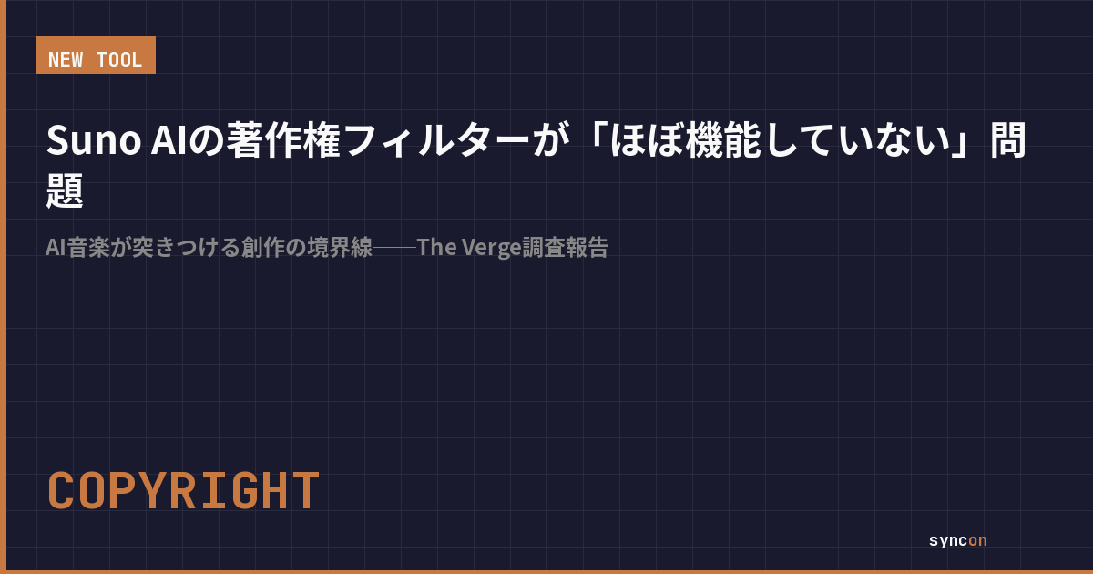 Sunoの問題は、AI音楽に限った話ではない。画像生成AIにおける著作権侵害、AIコード生成におけるライセンス問題──「AIが作ったもの」の権利と責任をどう扱うかは、あらゆる業種に関わるテーマだ。