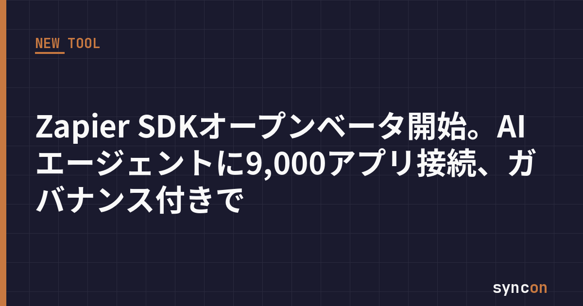 ノーコード自動化の代名詞だったZapierが、AI時代の「次の一手」をリリースした。4月21日、同社はZapier SDKのオープンベータを開始。AIコーディングエージェントに、Zapierの9,000以上のアプリ連携と30,000以上のアクションへのガバナンス付きアクセスを提供する。オープンベータ期間中は無料(ただしEnterprise・Teamプランはデフォルト除外)。